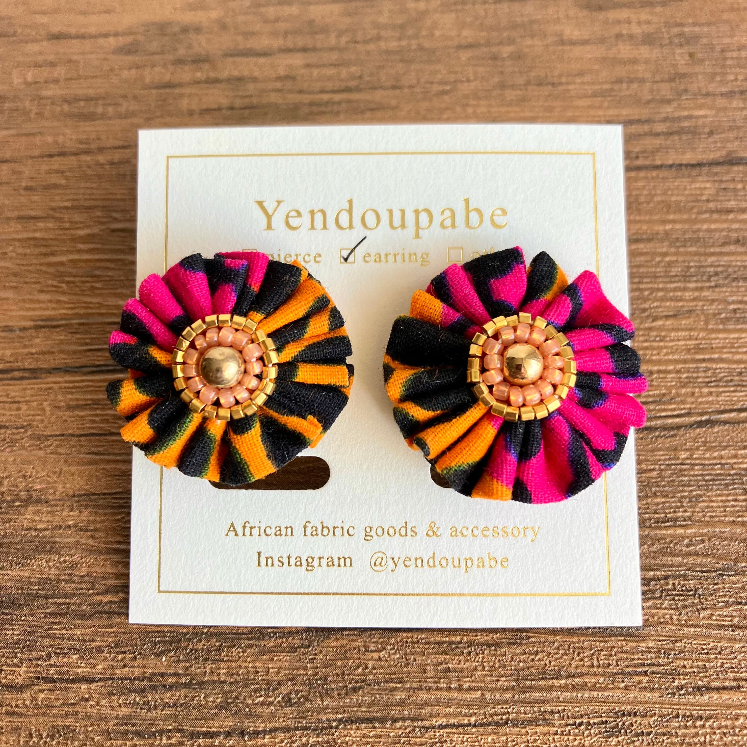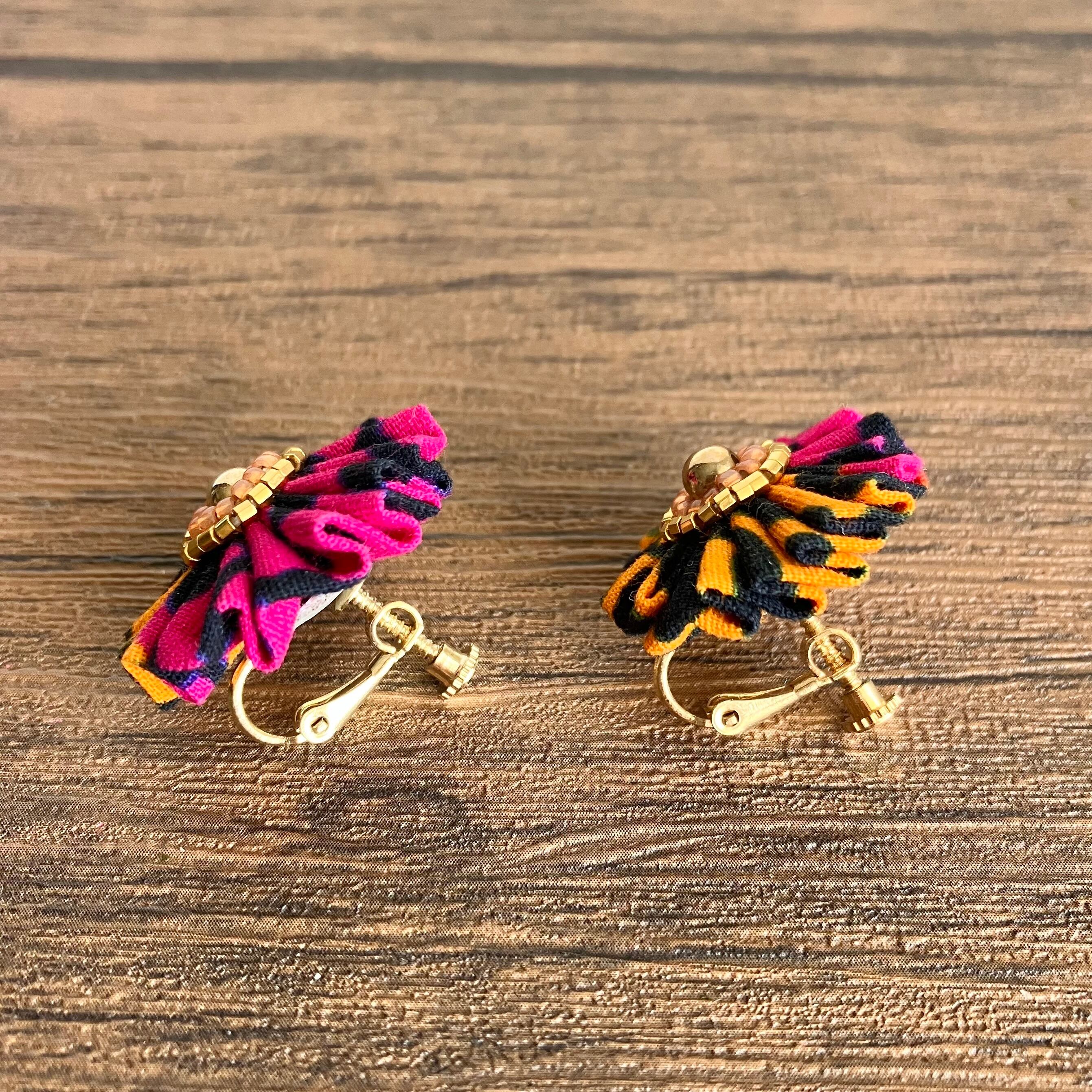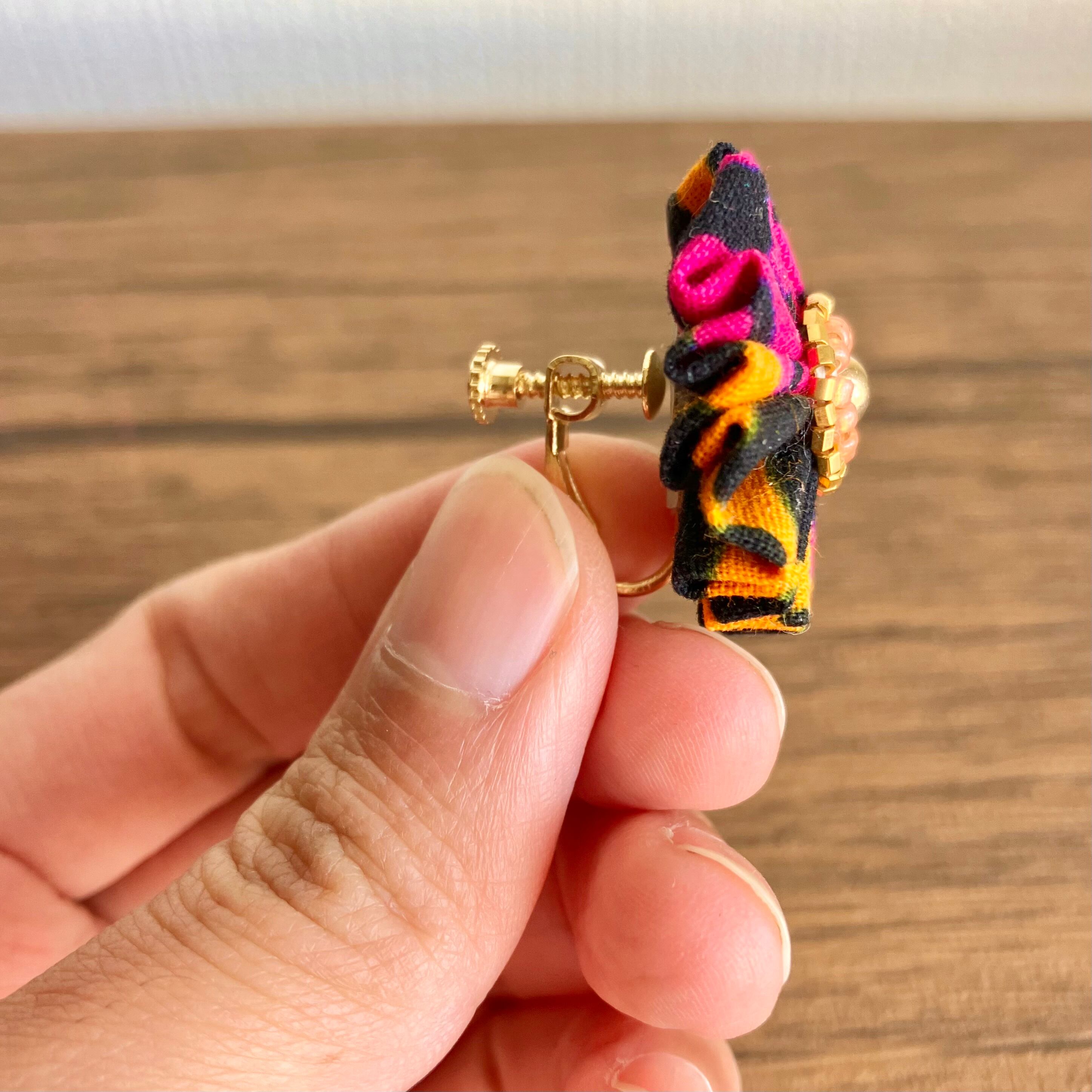 アフリカ布は、大きな柄のものも多く、切り取る箇所によって出てくる柄・色が少しづつ異なるため、お花の花弁に合わせて、ビーズの配色も選んでいます。