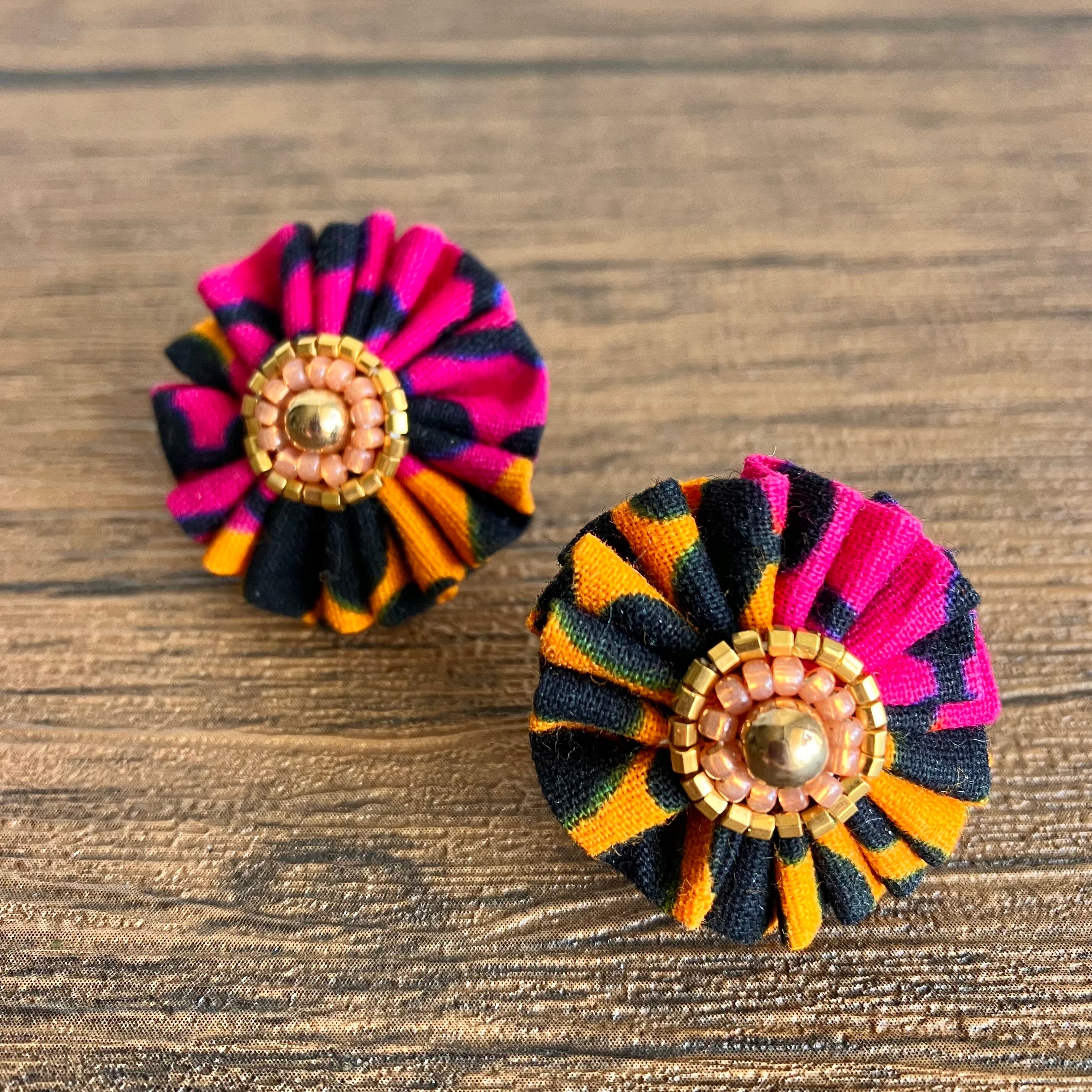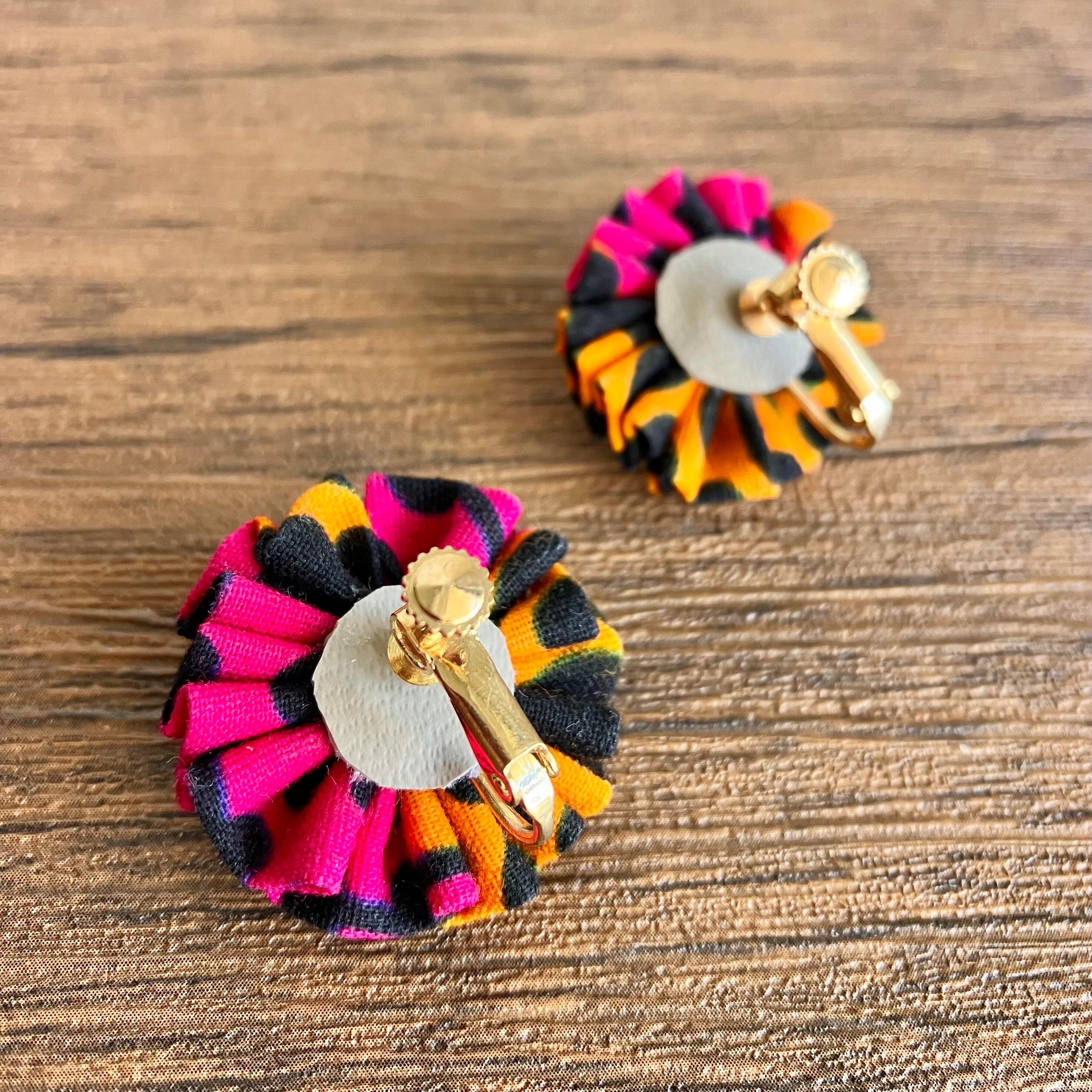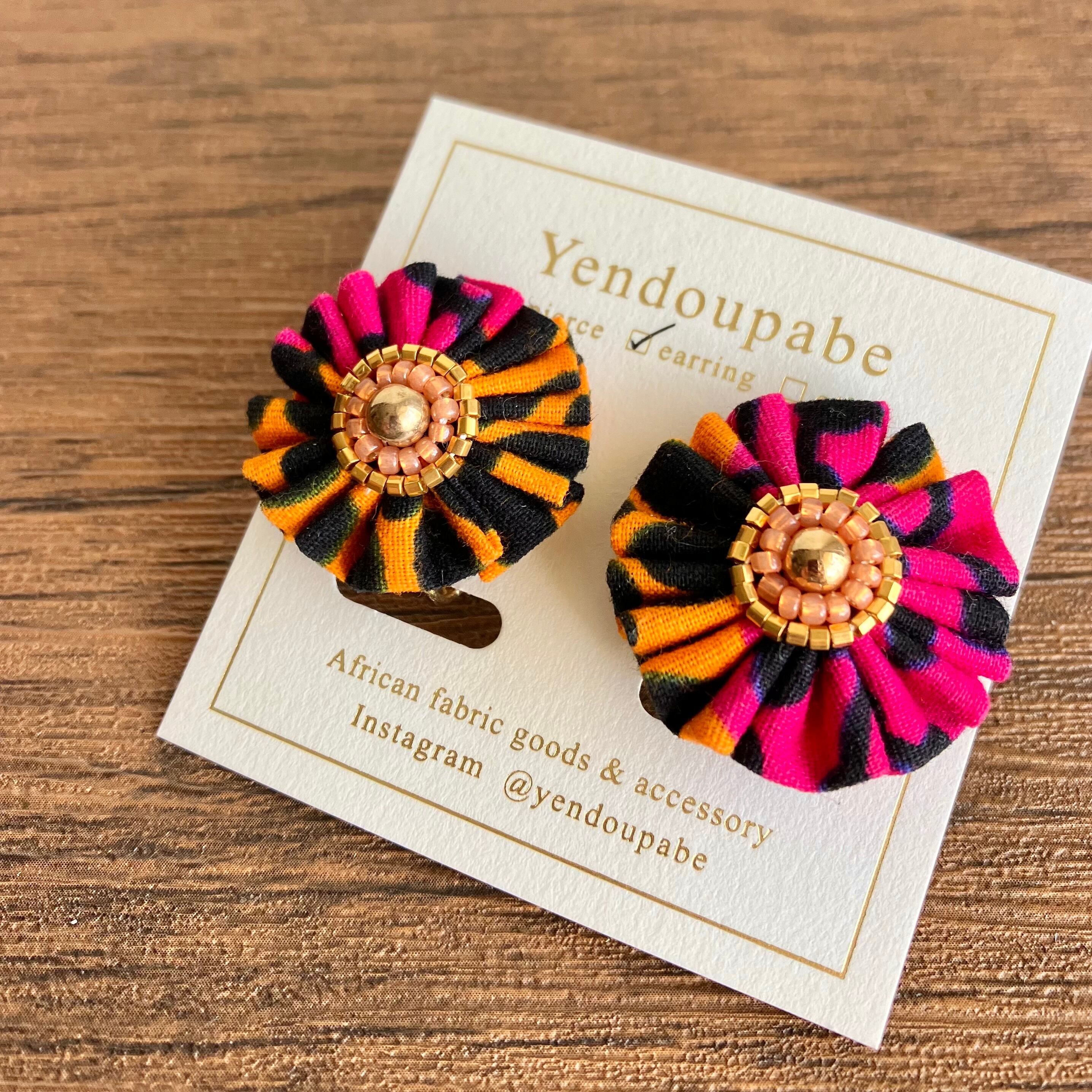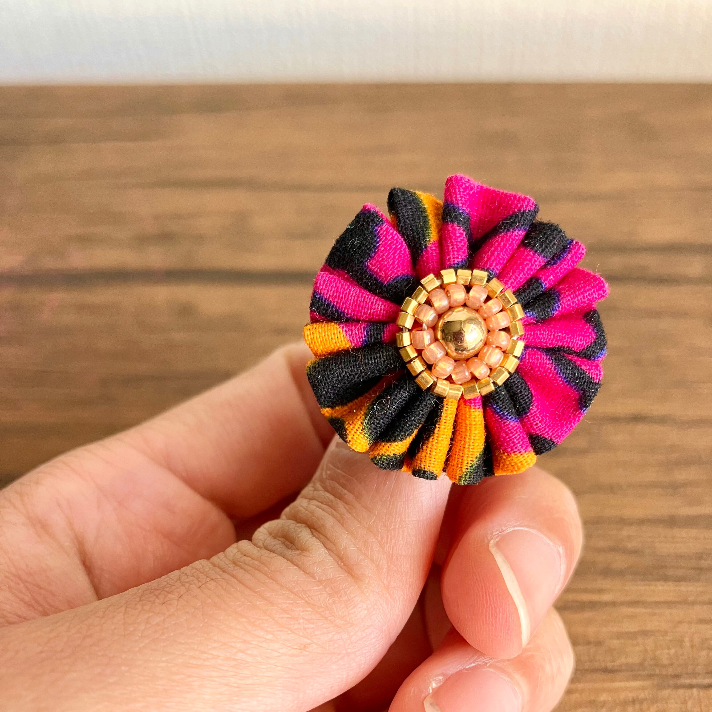 色鮮やかなアフリカ布を、くしゅくしゅっとしたお花に仕立てることで